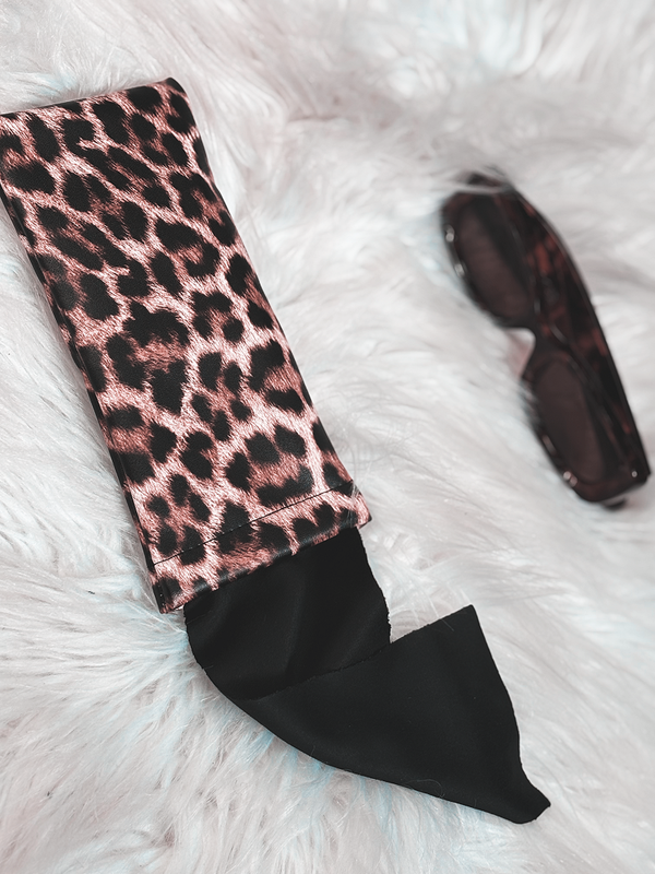 Étui à lunettes à motif léopard avec chiffon de nettoyage cousu dans la fermeture, parfait pour ne jamais la perdre.