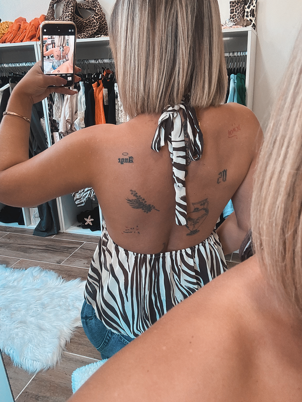 Top dos nu imprimé zébré avec décolleté plongeant.